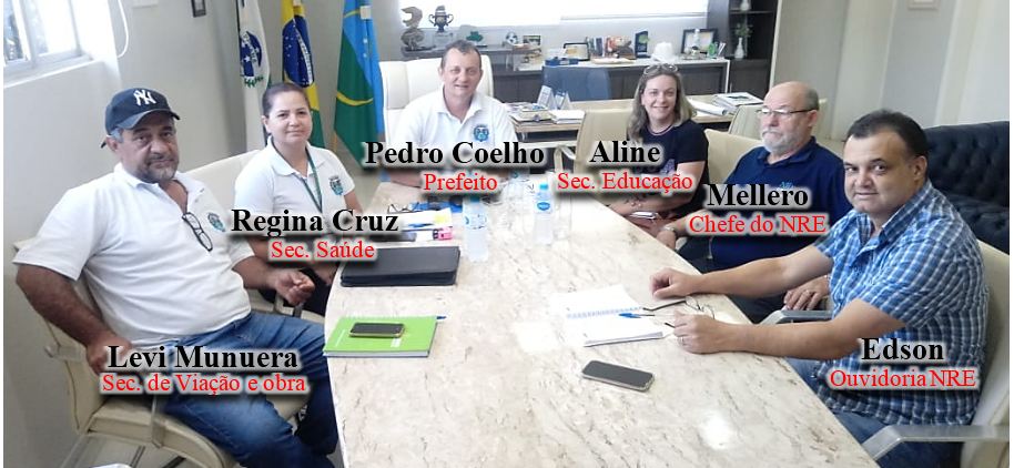 O Chefe do NRE Goioerê Valdemir Mellero e o ouvidor Edson Lopes, estiveram em reunião na tarde de quinta-feira (05) com o Prefeito Municipal de Goioerê Pedro Coelho, a Secretária Municipal de Educação Aline Suellen Batista, o Secretário de Viação e Obras Levi Munuera e a Secretária de Saúde Regina Cruz.