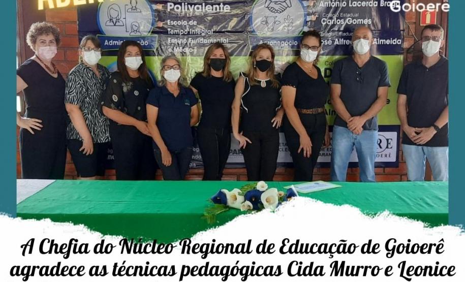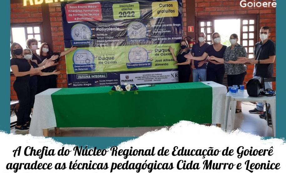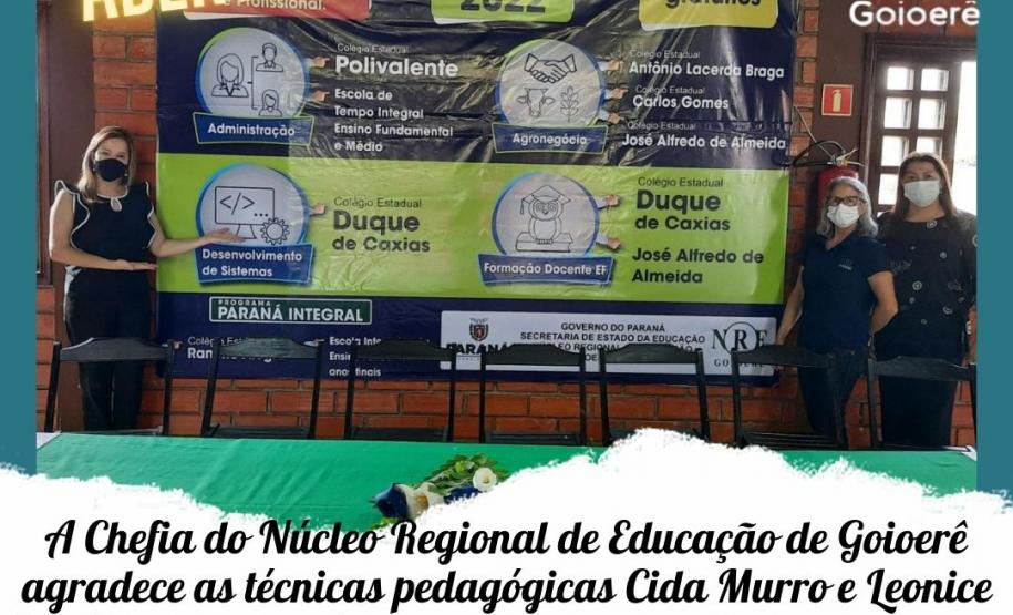 A Chefia do Núcleo Regional de Educação de Goioerê agradece as Técnicas Pedagógicas, Professora Cida Murro e Professora Leonice Serafim pela excelência no trabalho, dedicação e empenho, e parabeniza também toda a equipe do NRE de Goioerê.