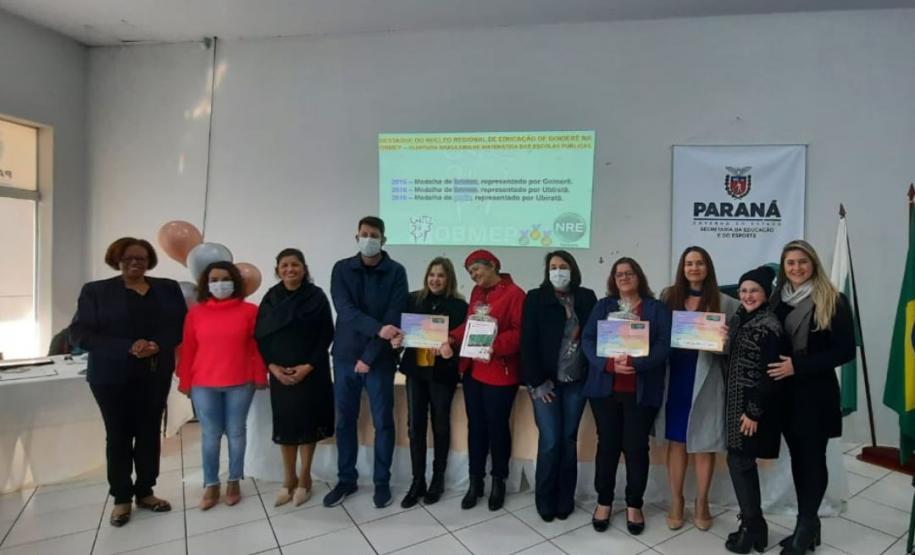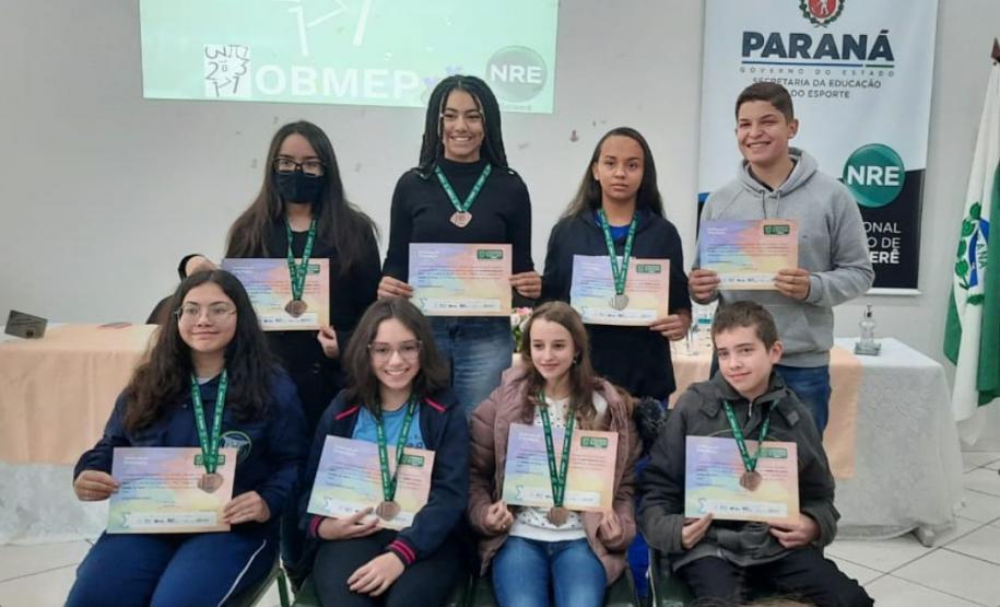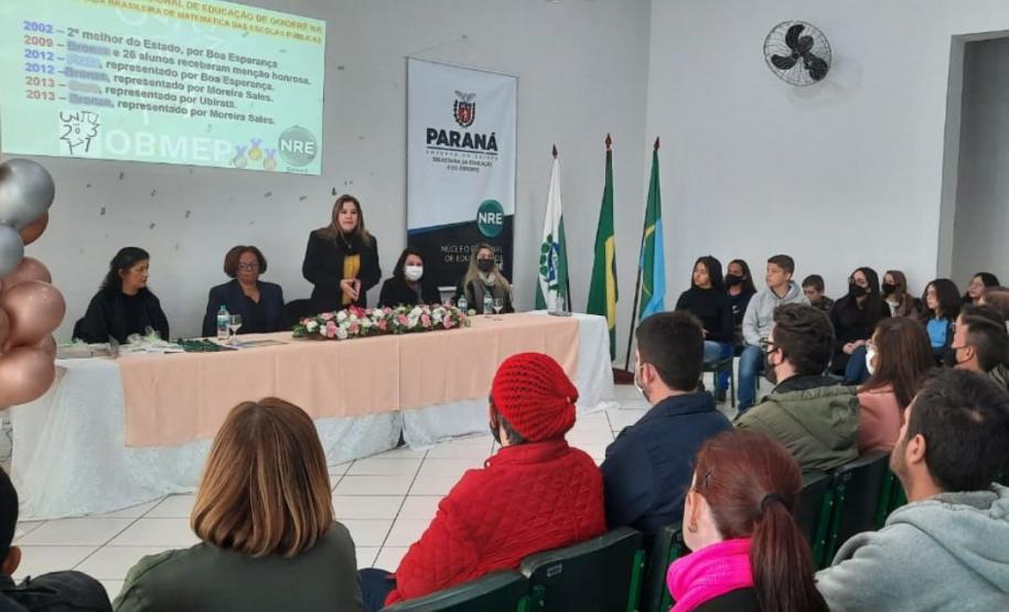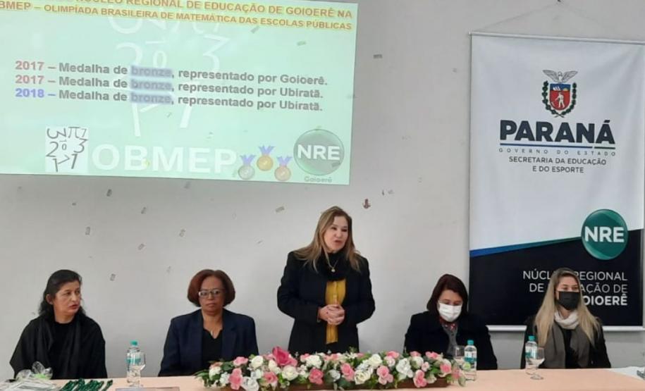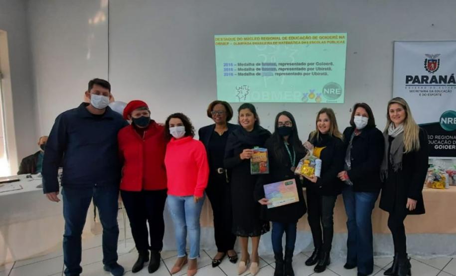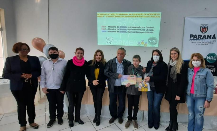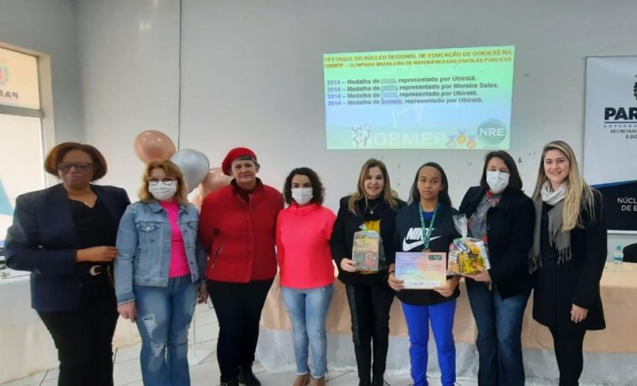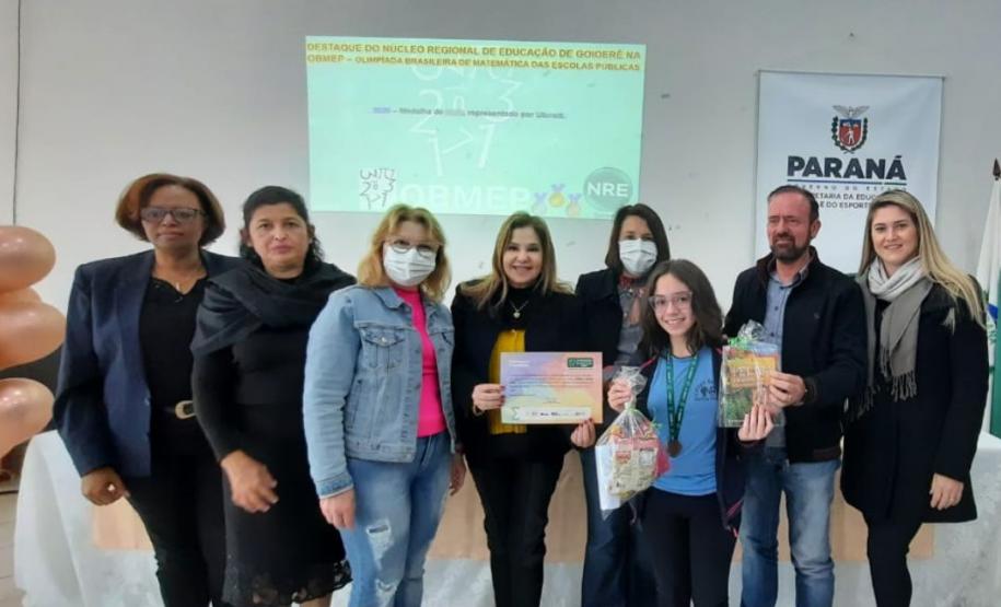 Na manhã dessa terça-feira (14), ocorreu no Núcleo Regional de Educação de Goioerê a Premiação da 16ª Olimpíada Brasileira de Matemática das Escolas Públicas-OBMEP/2021. Esta Olimpíada é uma iniciativa do Governo Federal, junto com o Instituto de Matemática Pura e Aplicada-IMPA e com parceria de Universidades Federais e Estaduais de todo o Brasil. Hoje, estiveram presentes neste Evento, a Coordenadora da OBMEP Regional Professora Drª Fabiana Magda Garcia Papani, da Universidade Estadual do Oeste do Paraná – UNIOESTE, juntamente com a Chefe do Núcleo Regional de Educação de Goioerê - Prof. Tânia Faria Henrique, equipe Diretiva, pais e Técnicos do Núcleo Regional de Educação para a entrega das medalhas; ouro, prata e bronze para os alunos; e os prêmios para as categorias: Escola e Professor. O Paraná tem participação expressiva nesta Olimpíada, que é incentivada pela Secretaria de Estado da Educação-SEED, que por meio dos Núcleos Regionais de Educação, articula o processo de divulgação, inscrição, organização das provas e premiações entre as Escolas participantes e as Coordenações Regionais da OBMEP. Na cerimônia os alunos: JÚLIA KARINA COSTA COUTINHO - POLIVALENTE GOIOERE, C E - E FUND MEDIO – Medalha de Bronze. LAIS VITORIA PEZOLATO RODRIGUES - COLEGIO ESTADUAL D. PEDRO II – EFM – Medalha de Bronze. IZABELLA MORAIS VIDAL - CARLOS GOMES, C E - E FUND MEDIO PROF – Medalha de Bronze. EVELYN AYUMI DANTAS EBUTI - CE CÍVICO-MILITAR OLAVO BILAC – EFM – Medalha de Bronze. GIOVANNA DAMACENO SILVA - ESCOLA ESTADUAL CECILIA MEIRELES – Medalha de Bronze. GABRIEL DOS ANJOS CARREIRA - COL EST PADRE JORGE SCHOLL – EFM – Medalha de Bronze. JOICI PEREIRA BORGES DA CRUZ - POLIVALENTE GOIOERE, C E - E FUND MEDIO – Medalha de Prata. O aluno HABYNNER SAMUEL G. OLIVEIRA - ESCOLA ESTADUAL CECILIA MEIRELES – Ubiratã recebeu o Certificado de Medalhista de Ouro, pois a medalha de ouro será entregue em cerimônia Nacional, em evento das Áreas de Ciências e Tecnologias. As professoras: PROFESSORA ROSE MARI BARCZAK RODRIGUES - POLIVALENTE GOIOERE, C E – ENSINO DE TEMPO INTEGRAL- FUND MEDIO. PROFESSORA DINA MARTA SABO - ESCOLA ESTADUAL CECILIA MEIRELES – ENSINO FUNDAMENTAL E MÉDIO. E a Escola Estadual CECÍLIA MEIRELES foi homenageada pelo desempenho dos seus alunos.