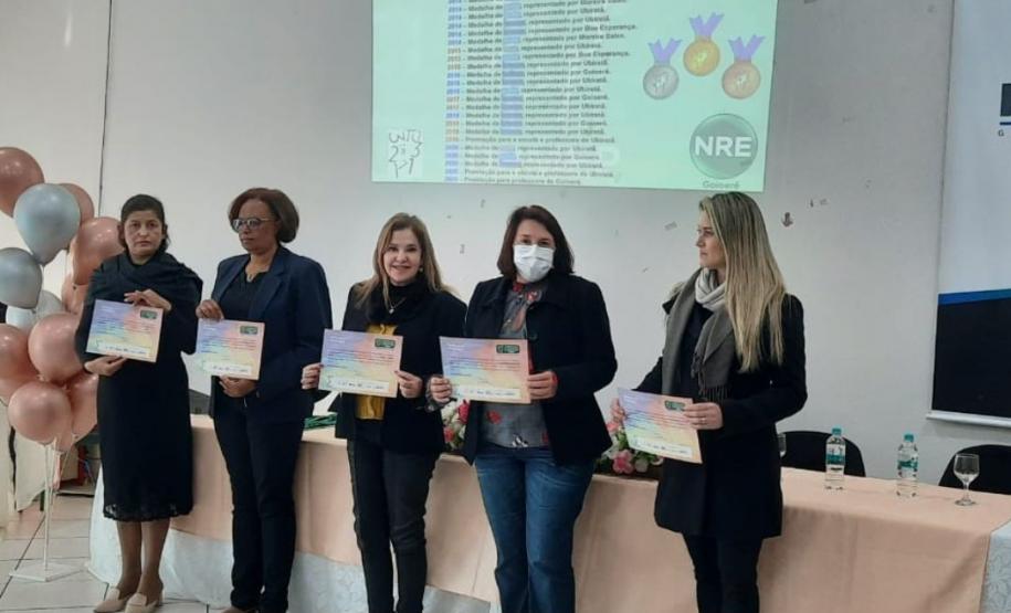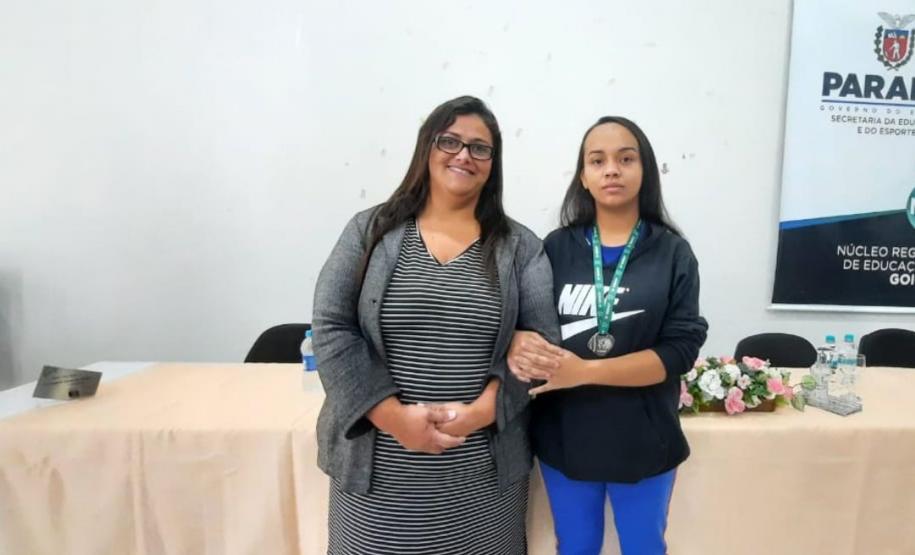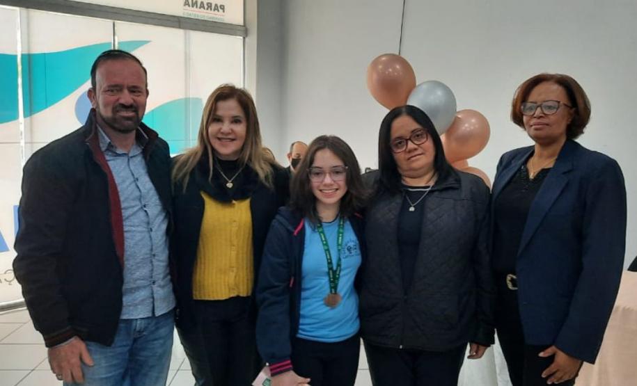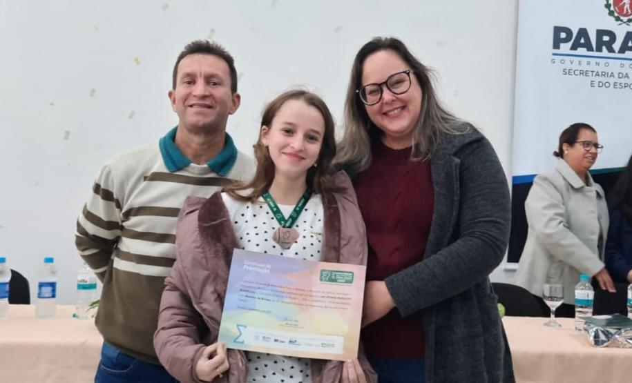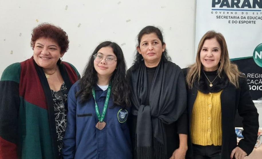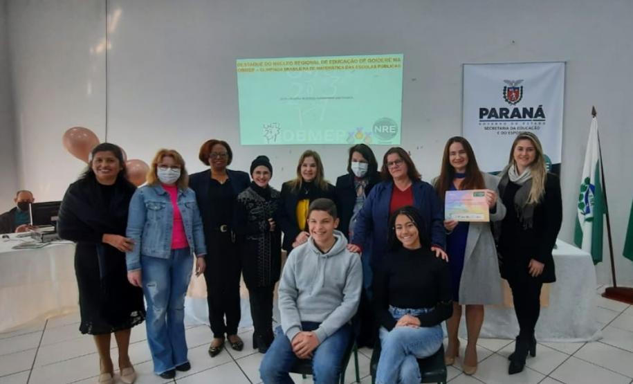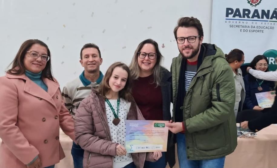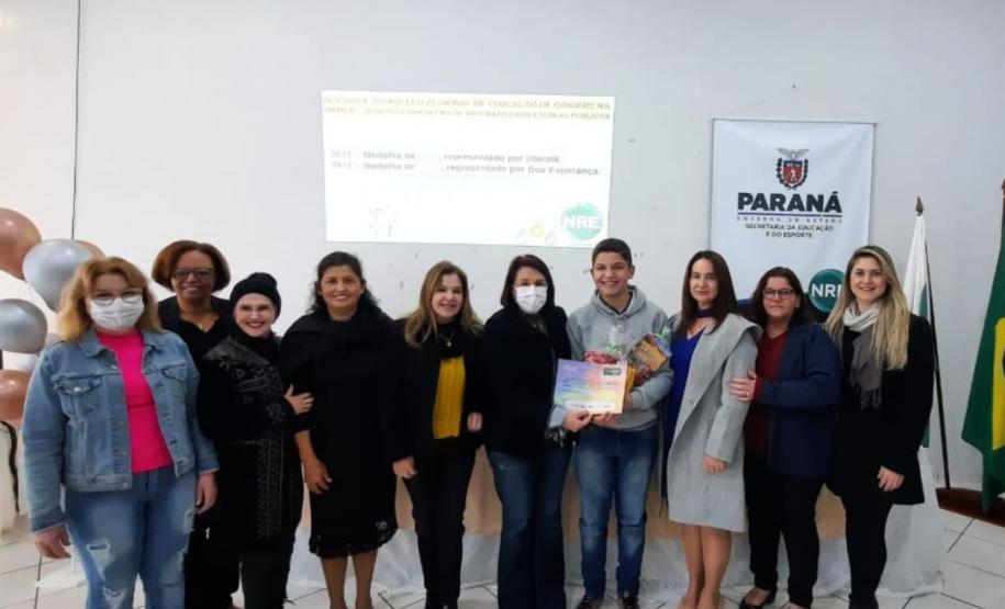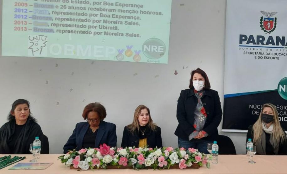 Na manhã dessa terça-feira (14), ocorreu no Núcleo Regional de Educação de Goioerê a Premiação da 16ª Olimpíada Brasileira de Matemática das Escolas Públicas-OBMEP/2021. Esta Olimpíada é uma iniciativa do Governo Federal, junto com o Instituto de Matemática Pura e Aplicada-IMPA e com parceria de Universidades Federais e Estaduais de todo o Brasil. Hoje, estiveram presentes neste Evento, a Coordenadora da OBMEP Regional Professora Drª Fabiana Magda Garcia Papani, da Universidade Estadual do Oeste do Paraná – UNIOESTE, juntamente com a Chefe do Núcleo Regional de Educação de Goioerê - Prof. Tânia Faria Henrique, equipe Diretiva, pais e Técnicos do Núcleo Regional de Educação para a entrega das medalhas; ouro, prata e bronze para os alunos; e os prêmios para as categorias: Escola e Professor. O Paraná tem participação expressiva nesta Olimpíada, que é incentivada pela Secretaria de Estado da Educação-SEED, que por meio dos Núcleos Regionais de Educação, articula o processo de divulgação, inscrição, organização das provas e premiações entre as Escolas participantes e as Coordenações Regionais da OBMEP. Na cerimônia os alunos: JÚLIA KARINA COSTA COUTINHO - POLIVALENTE GOIOERE, C E - E FUND MEDIO – Medalha de Bronze. LAIS VITORIA PEZOLATO RODRIGUES - COLEGIO ESTADUAL D. PEDRO II – EFM – Medalha de Bronze. IZABELLA MORAIS VIDAL - CARLOS GOMES, C E - E FUND MEDIO PROF – Medalha de Bronze. EVELYN AYUMI DANTAS EBUTI - CE CÍVICO-MILITAR OLAVO BILAC – EFM – Medalha de Bronze. GIOVANNA DAMACENO SILVA - ESCOLA ESTADUAL CECILIA MEIRELES – Medalha de Bronze. GABRIEL DOS ANJOS CARREIRA - COL EST PADRE JORGE SCHOLL – EFM – Medalha de Bronze. JOICI PEREIRA BORGES DA CRUZ - POLIVALENTE GOIOERE, C E - E FUND MEDIO – Medalha de Prata. O aluno HABYNNER SAMUEL G. OLIVEIRA - ESCOLA ESTADUAL CECILIA MEIRELES – Ubiratã recebeu o Certificado de Medalhista de Ouro, pois a medalha de ouro será entregue em cerimônia Nacional, em evento das Áreas de Ciências e Tecnologias. As professoras: PROFESSORA ROSE MARI BARCZAK RODRIGUES - POLIVALENTE GOIOERE, C E – ENSINO DE TEMPO INTEGRAL- FUND MEDIO. PROFESSORA DINA MARTA SABO - ESCOLA ESTADUAL CECILIA MEIRELES – ENSINO FUNDAMENTAL E MÉDIO. E a Escola Estadual CECÍLIA MEIRELES foi homenageada pelo desempenho dos seus alunos.