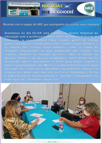 Notícias Reunião com a equipe do NRE que acompanha às escolas cívico-militares 06/04/2021 - 14:20 GALERIA DE IMAGENS Designação de DiretoresFoto: NRE de GoioerêDesignação de DiretoresFoto: NRE de Goioerê Compartilhe: Voltar Início Imprimir Baixar