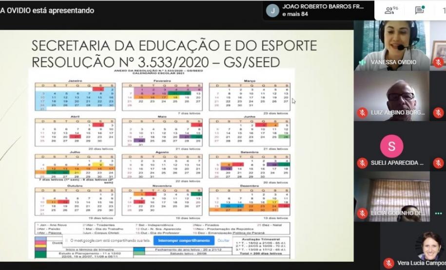 Na reunião, a Professora Vanessa divulgou às instituições de ensino da rede pública estadual, às instituições de ensino das redes públicas municipais, às instituições parceiras e ás mantidas pela iniciativa privada, as orientações contidas na Resolução nº 3.533/2020 – GS/SEED e na instrução normativa nº 01/2020 – DLE/DPGE/SEED, orientando as instituições de ensino que integram o Sistema Estadual, na elaboração dos seus Calendários Escolares de 2021 e solicitando os documentos da legislação vigente, necessários para auxiliar na análise do Calendário. Articulando e pactuando às especificidades locais de cada município pertencente ao nosso NRE, desde que respeitadas as datas estabelecidas na Resolução nº 3.533/2020.