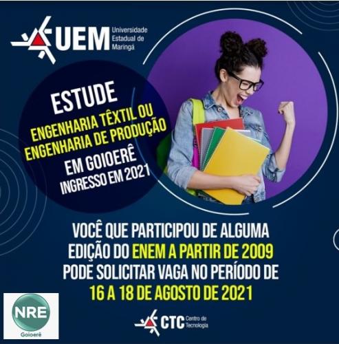Notícias VAGAS PARA CURSOS DA UEM 01/01/1970 - 11:10 Quer estudar na UEM? Ainda dá tempo de entrar em 2021! Compartilhe: Voltar Início Imprimir Baixar